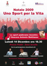 Mondo dello sport padovano al gran completo lunedì 14 dicembre al Pala Alì dell’Arcella per incontrare il vescovo di Padova Monsignor Antonio Mattiazzo in occasione delle prossime festività natalizie. La festa, con inizio alle ore 18.30, proporrà spettacolari esibizioni e momenti di riflessione sul senso più profondo dello sport, grazie alle testimonianze di sportivi del calibro di Alex Zanardi, Vincenzo Italiano e Lorenzo Bernardi. La serata sarà condotta dalla giornalista Micaela Faggiani e dall’atleta Rossano Galtarossa, presenti il sindaco Flavio Zanonato, la presidente della Provincia Barbara Degani, l’assessore allo sport del Comune Claudio Sinigaglia e l’assessore allo sport della Provincia Leandro Comacchio. La serata sarà anche l’occasione per festeggiare e ringraziare gli atleti e le società sportive padovani che più si sono distinti nel 2009: